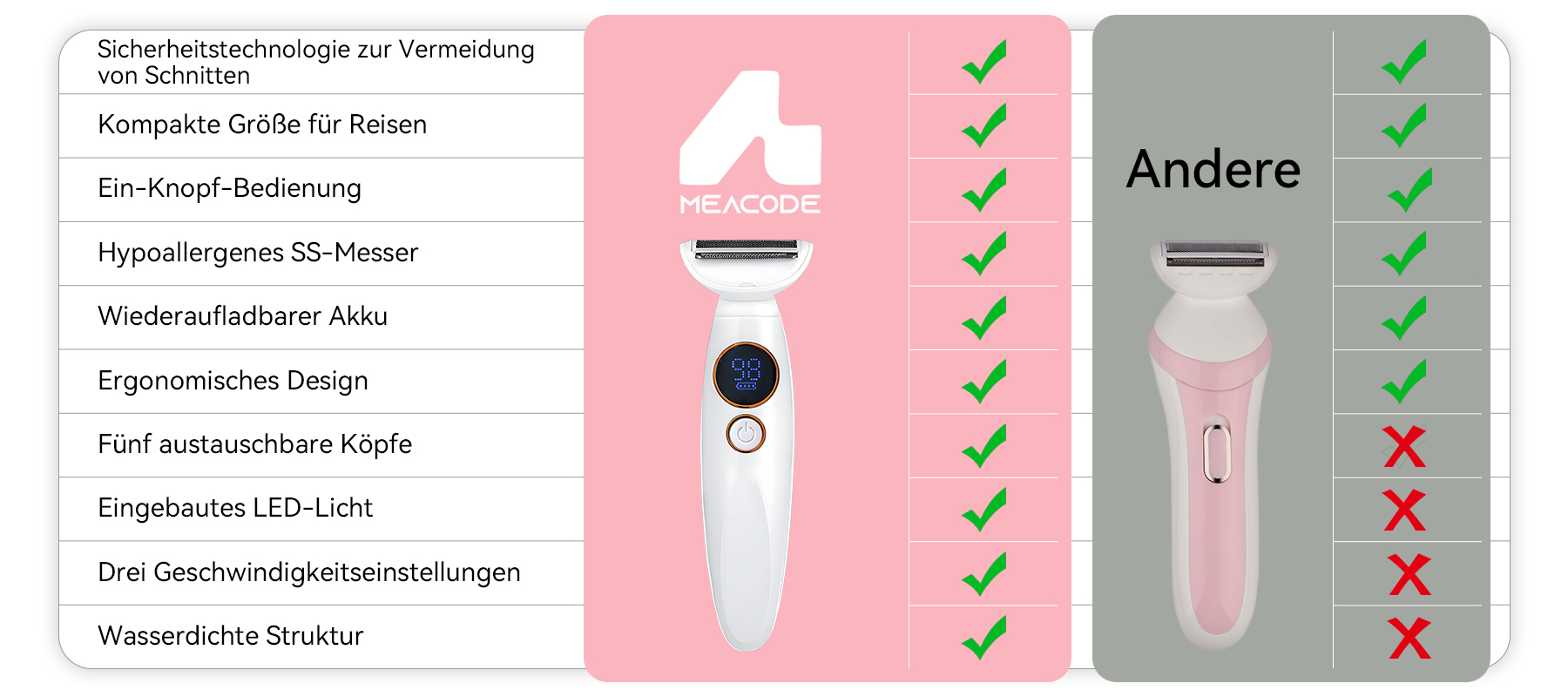 Ein herkömmlicher Rasierer fühlt sich anfangs möglicherweise etwas glatter an, weil er unter die Haut schneidet, aber das ist es, was eingewachsene Haare verursacht. Meacode schneidet auf Hautniveau, was zu 95 % so nah ist, aber ohne die schmerzhaften Folgen. Die meisten Nutzer finden, dass jeder geringfügige Unterschied in der anfänglichen Glätte die Eliminierung von Rasurbrand und Unebenheiten mehr als wert ist.