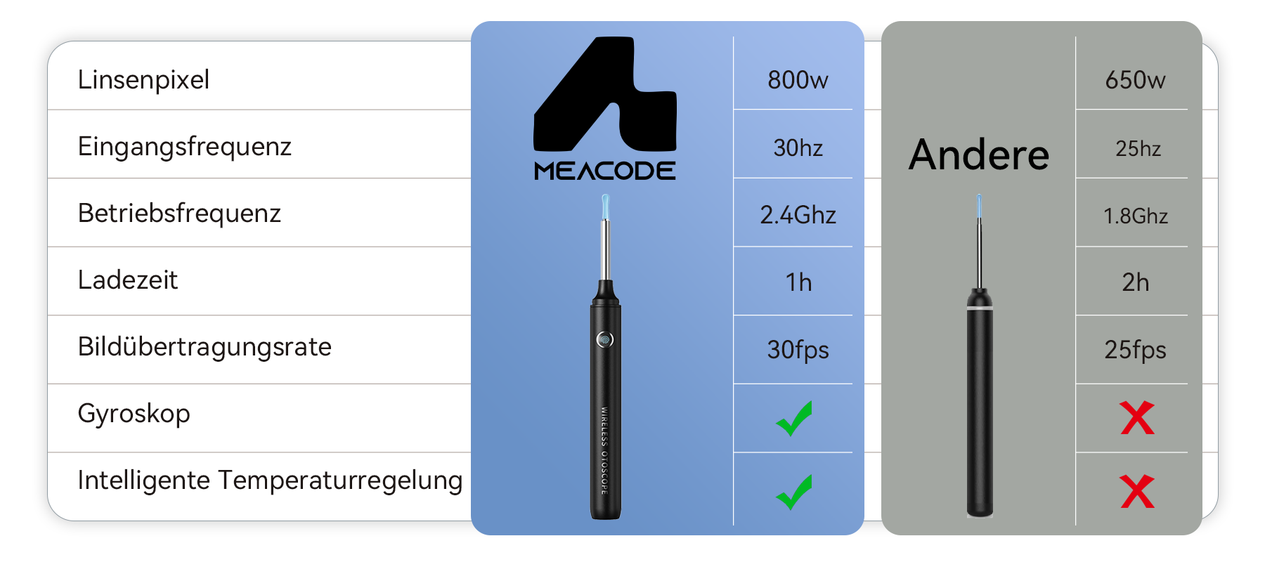 Das Meacode visuelle Ohrenreinigungswerkzeug wurde geboren. Es verwendet eine fortschrittliche Fusion von Präzisionsstabilisierung und einem 8MP hochpräzisen professionellen Endoskop, um eine klare und sichere Reinigung zu gewährleisten. Meacodes Kernmission ist es, Sie niemals im Stich zu lassen und die Gesundheit und die Seelenruhe Ihrer Familie zu schützen.