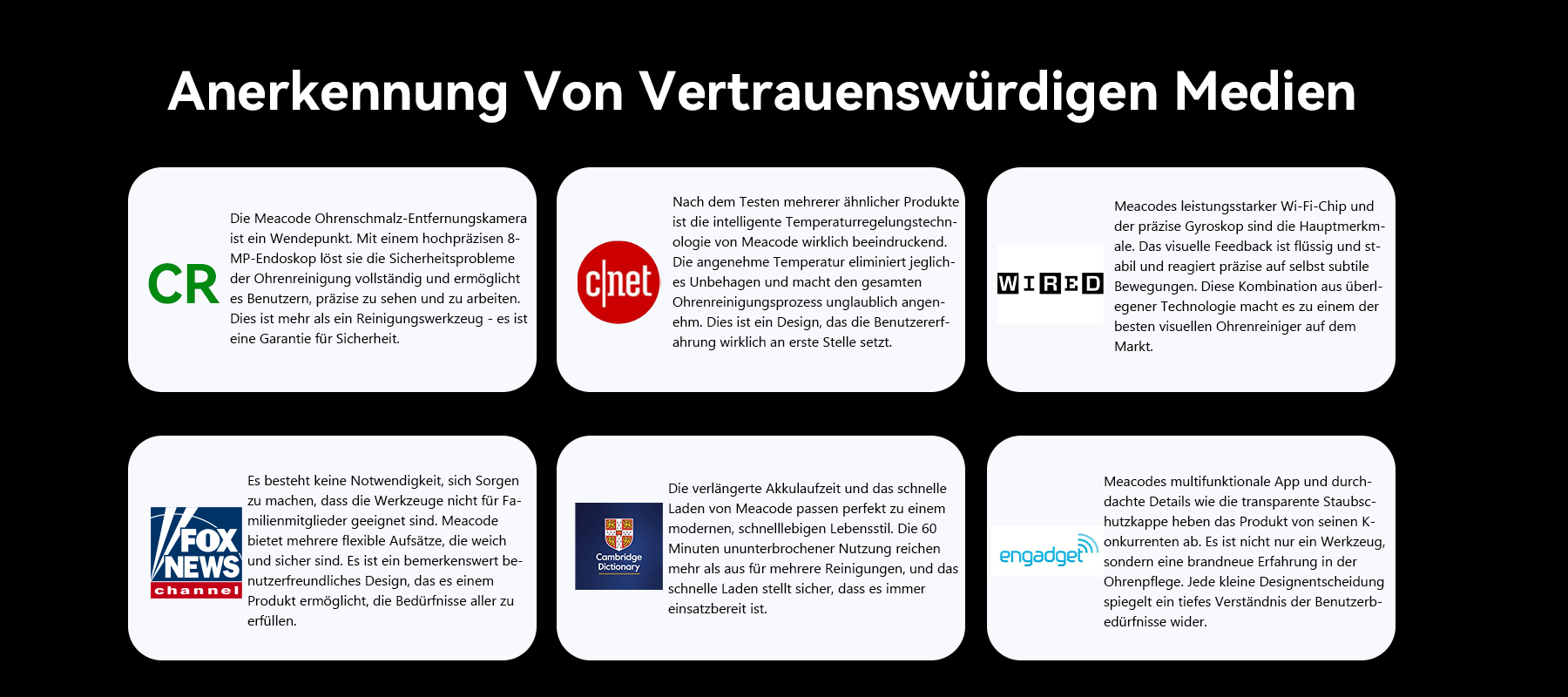 Ja, er ist sehr sicher. Der Meacode verwendet eine 8MP hochpräzise Kamera, die es Ihnen ermöglicht, in Ihren Gehörgang zu sehen und so das "blinde Graben" zu eliminieren. Der Ohrlöffel und die Kamera verfügen auch über eine smarte Temperaturkontrolle, die sicherstellt, dass sich das Gerät angenehm und sanft anfühlt. Seine weichen, flexiblen Ohrlöffel machen ihn für die ganze Familie geeignet.